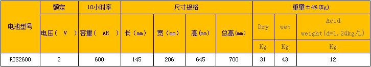 简单介绍:管式富液蓄电池RTS2600(OPzS)系列产品的特点:标称电压:2V、6V、12V;额定容量: 60 Ah~3000Ah,符合DIN40736和2EC60896-21标准,特别应用于太阳能、风力发电站、开关及控制系统等领域。...