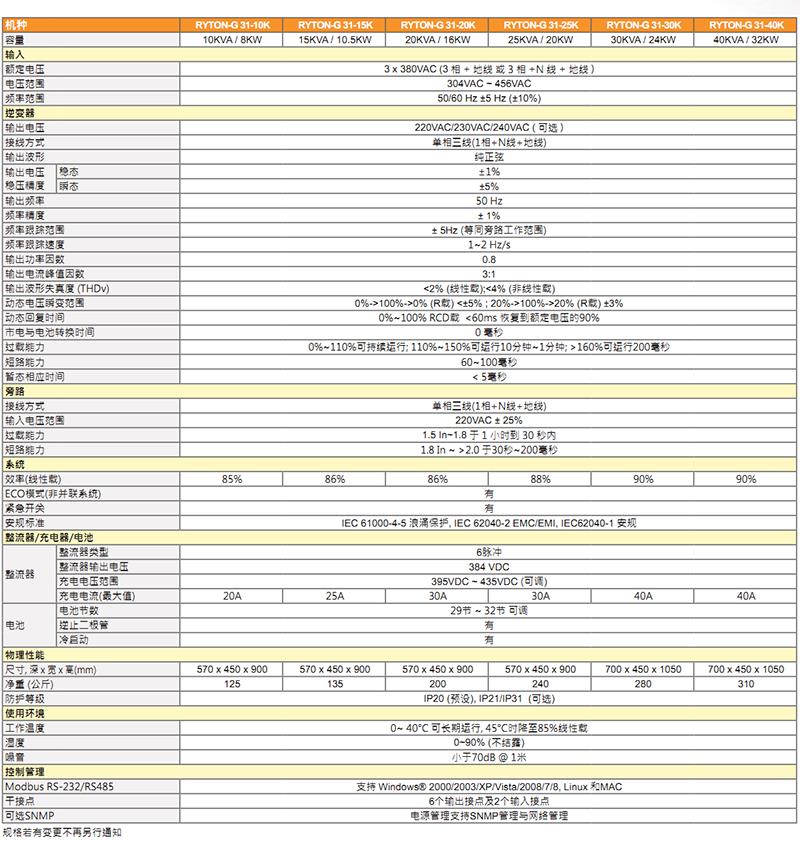 日月潭UPS不间断电源RYTON-G 3/1(384V)系列产品特点: