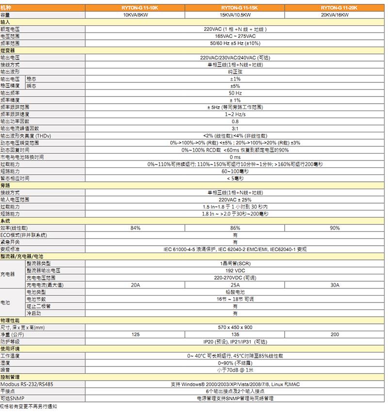 日月潭UPS不间断电源RYTON-G 1P/1P系列技术参数: